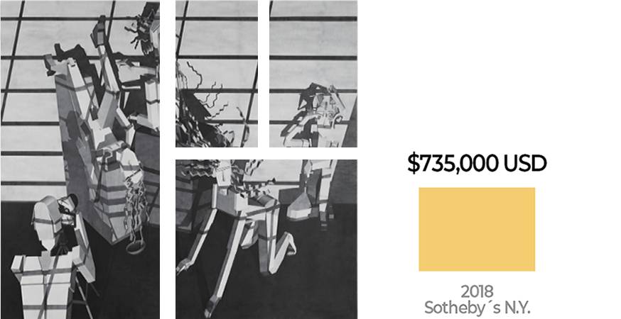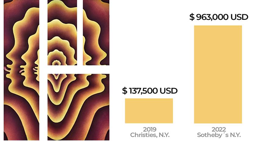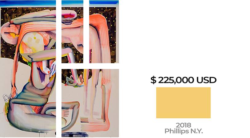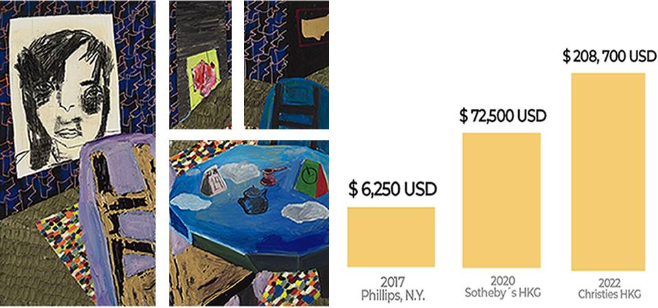 Su lienzo “Lick Lick in Orange and Blue” fue adquirido en Nueva York por 137,500 dólares en 2019 y posteriormente revendido en Hong Kong por 963,000 dólares; es decir, la obra aumentó 7 veces más su valor en su segunda venta en abril de 2022.