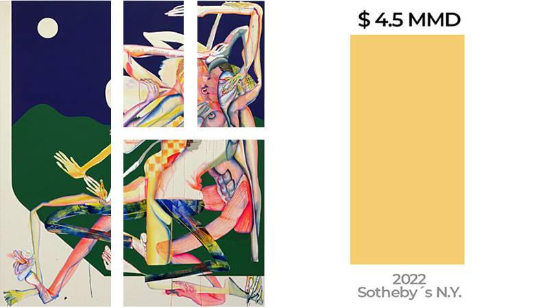 Su obra ha tenido un asombroso crecimiento en valor comercial. En 2017, cuando tenía solo 30 años, vendió un primer lienzo por 36,000 dólares. Al año siguiente, en 2018, la obra “Fellow Travelers, Flaming Creatures”, obtuvo en subasta la inesperada cantidad de 735,000 dólares. Con 35 años de edad, los precios de la artista han aumentado de nuevo, hasta los 5.2 millones de dólares con su pintura “Happening”, vendida en 2022.