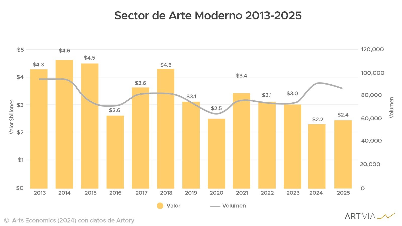 El arte moderno mostró señales claras de recuperación en 2025. Tras varios años de descensos, el sector creció un 9% y alcanzó aproximadamente 2.400 millones de dólares en ventas.